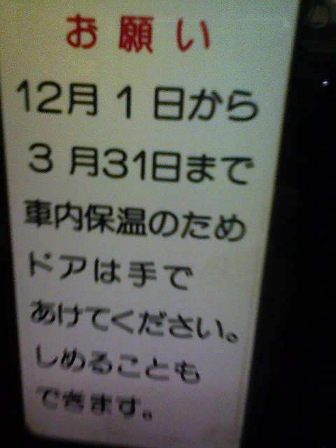引っ越してきたばかりの<異邦人>の目についたこと。 まず↓。 確かに寒いので、乗降がない、と判断した瞬間にボタン押して閉められるのはありがたい。 でも、別の車両は↓だった。 乗る時間帯が早朝、もしくは夜なのでアレだが、昼間も<これ>を守るのだろうか? 確認したいが機会がない。 ・・・こちら(完全手動)の車両にちょうど乗っていたとき。降りる客が手で開けた瞬間、 「ばかやろう、テメェ!」 という怒声とともに乗り込んで来たご仁がいた。で、すでに座っている他客の足下に傘を放り投げ、さらに「莫迦野郎」を連発しながら他の車輌に行ってしまった。 時刻は午後6時半くらい。アルコールででき上がっているのか、他のブツでラリっているのか、興味はあったが刺されても困るので放置した。 反面教師にさせてもらう。 タイトルは、JRのアナウンスで時おり使われる小ネタ。 |