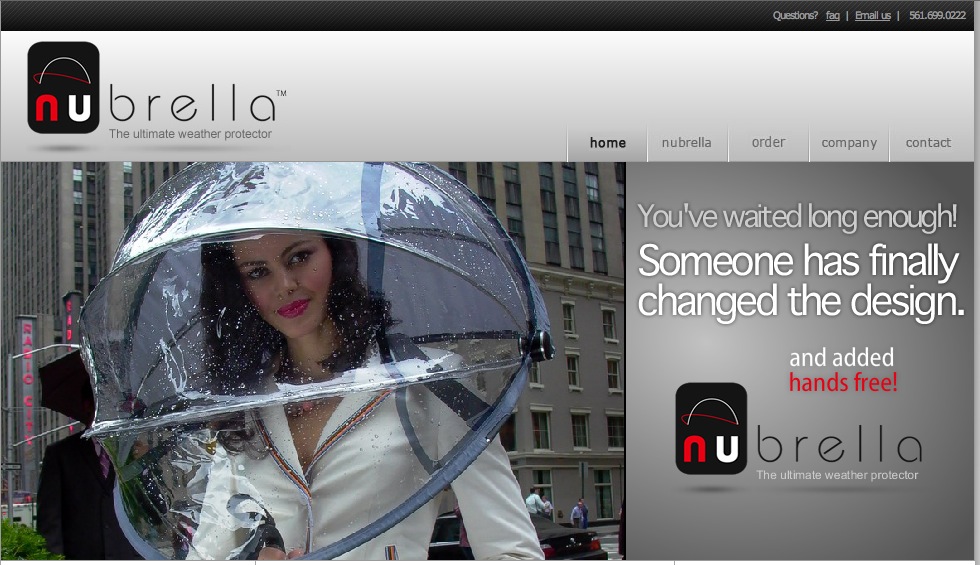 夕方から出かけるのに、なんとなく憂鬱。 今の住み処に引っ越してきてから、「雨が多い」のは仕方がないと思っている。 でも、なんとかしたいと思っていた。 そうしたら、こんなモノを見つけた↓。 <Nubrella>というらしい。 両手が自由になり、さらに突風でも悲惨なコトになることがない。 なんとたったの60$! ・・・誰か<人柱>になってみてはどうか。 |