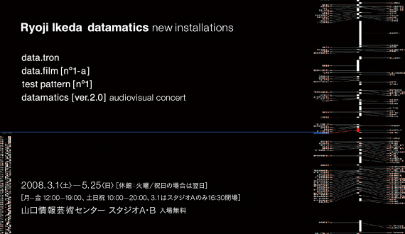 新山口駅から2時間近くバスで揺られた某温泉。 これは、まあ仕事の関係。 決してワルイコトをしに行った訳ではない。 23日。 せっかく山口まで出向いたので、ちょうど行われていた展覧会に行った。 <Ryoji Ikeda datamatics -new installations-> 以前の「こちらの記事」や「こちらの記事」紹介したことがある、京都のパフォーマンスグループ<Dumb Type(ダムタイプ)>の舞台音楽ほかで知られる<池田亮司>。 彼の新作インスタレーション<data.tron>や<datamatics[ver.2.0]>を始めとするプロジェクト<Datamatics>を展示中。 <山口情報芸術センター(YCAM)>にて、5月25日(火曜休館)まで開催中。 実際のインスタレーションの一部を<こちら>でご紹介しておく。 また、画質は落ちるがようつべからもいくつか↓ 彼の作品は国内ではなかなか手に入れにくいのだが、最新作<test pattern>はエイベックスグループの中の[commons]レーベルから輸入盤の形で入手可能。 今回の記事タイトルはフィボナッチ数である。 |